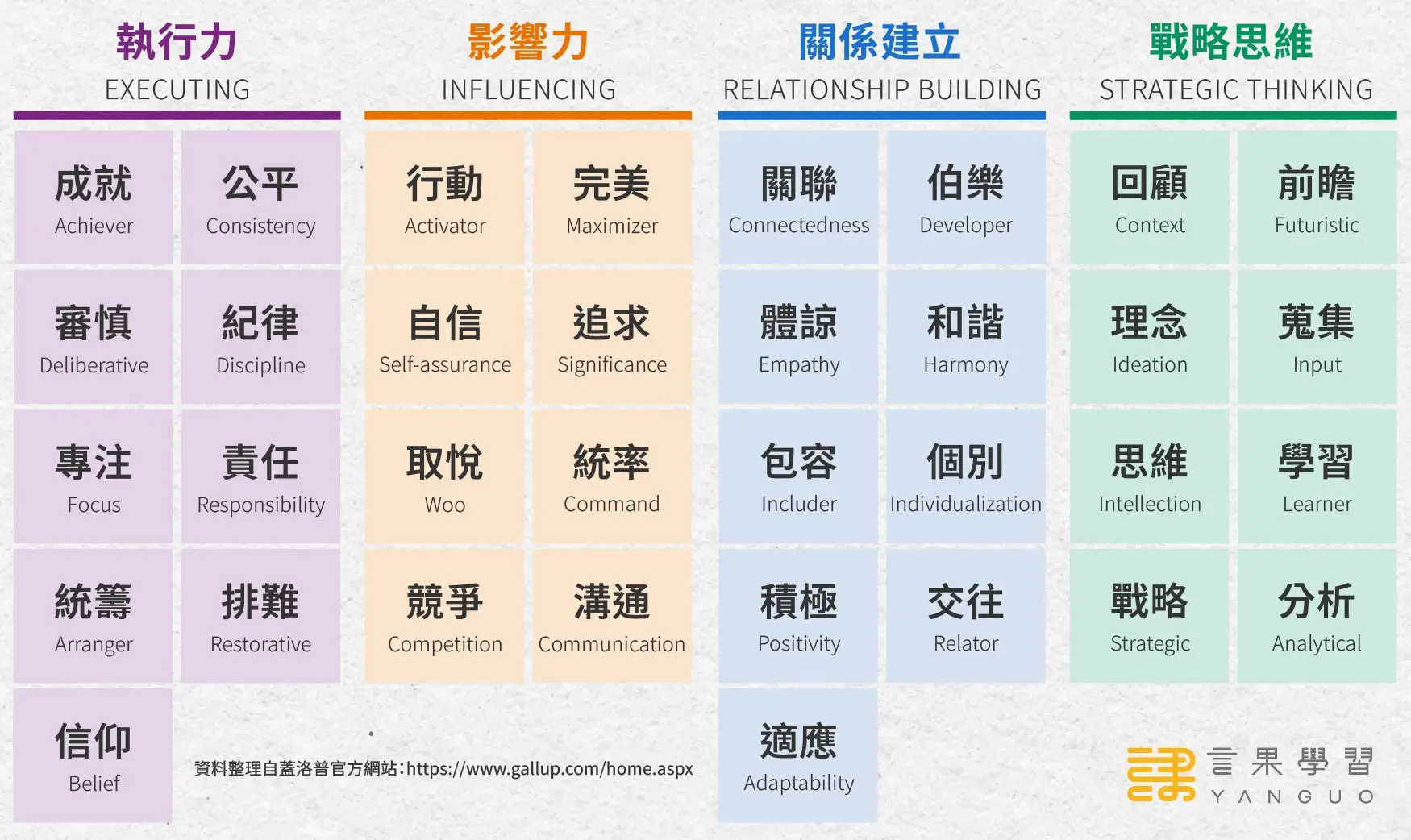 蓋洛普優勢測驗將 34 項天賦主題分成「執行力」、「影響力」、「關係建立」與「戰略思維」這 4 大類。此環節的核心精神是讓中高階主管更了解自己與生俱來的優勢,也幫助教練能在後續的輔導中,依據每位主管的獨特潛力與行為模式做出最合適的規劃。