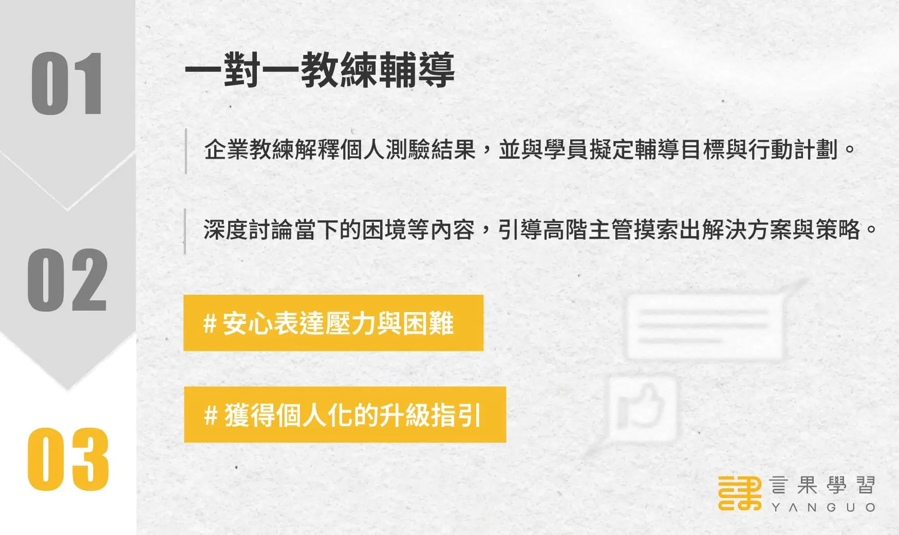 - 缺少「一對一教練輔導」:學員更認識自己但難以針對實際管理難題改善與成長