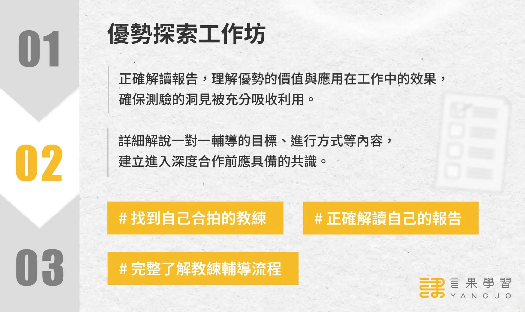 測驗、工作坊、一對一輔導,跟企業教練用 3 階段發揮優勢